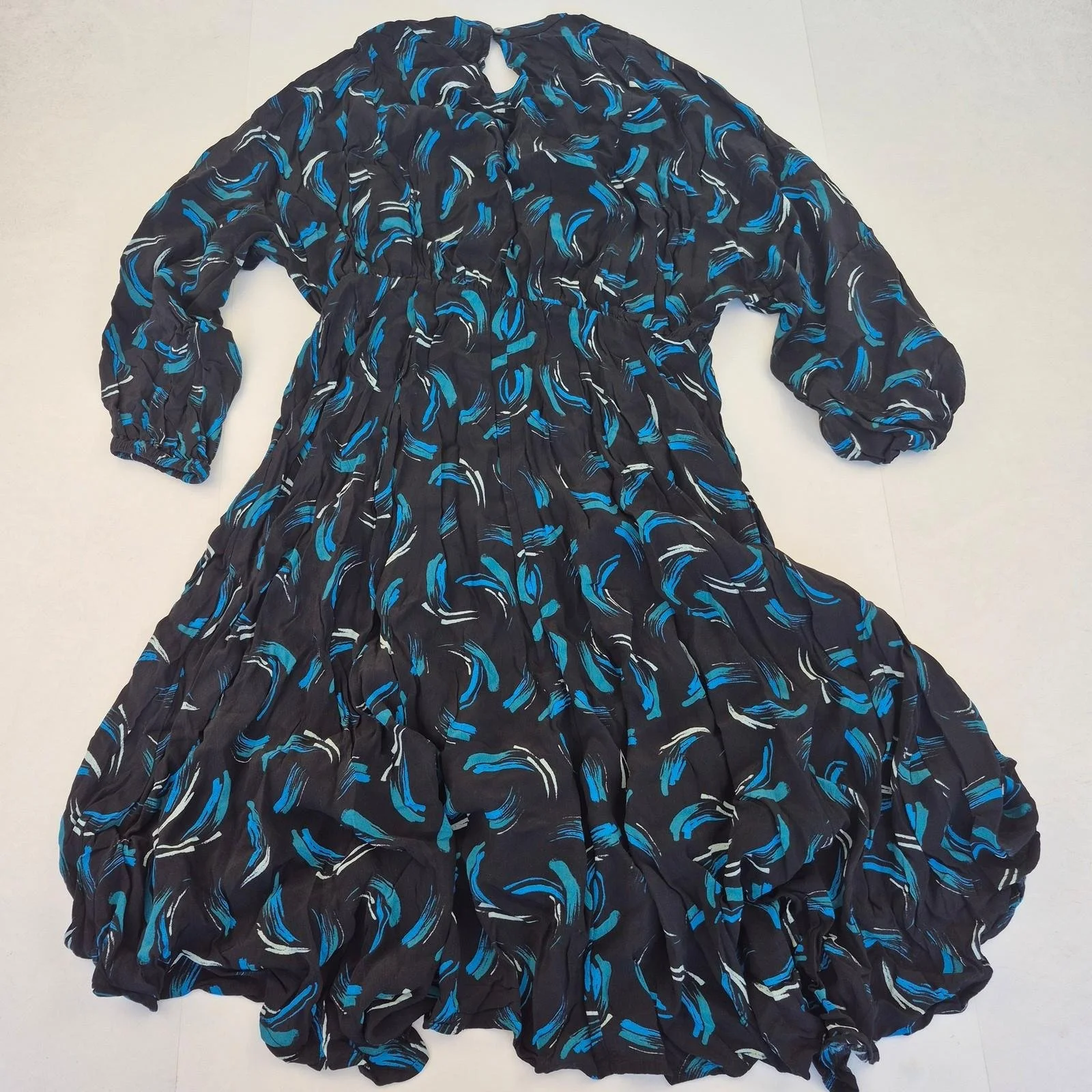 MONSOON Dress Medium 12 14 Black Blue Women's Viscose Midi Long Sleeve Patterned